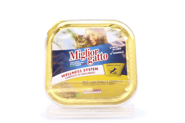 Κρέας και υποπροϊόντα κρέατος (κοτόπουλο κατ' ελάχιστο 5,0%, κουνέλι κατ' ελάχιστο 5,0%), έλαια και λίπη, ανόργανες πρώτες ύλες ζωοτροφών. Αναλυτικά συστατικά: ακατέργαστες διατροφικές ίνες 5,5%, ακατέργαστη τέφρα 2,0%, ακατέργαστη πρωτεΐνη 10,0%, ακατέργαστα έλαια & λίπη 0,3%, υγρασία 81,0%. Διατροφικές πρόσθετες ύλες (ανά kg προϊόντος): Βιταμίνη D3 150 I.U., Βιταμίνη Ε (σε ατοκοφερόλη) 15mg, Θειικός χαλκός (σε Cu) 2mg.