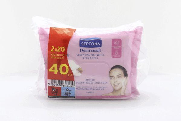 Τα υγρά μαντηλάκια καθαρισμού προσώπου και ματιών SEPTONA Dermasoft με εκχύλισμα ορχιδέας και φυτικό κολλαγόνο αφαιρούν αποτελεσματικά το αδιάβροχο μακιγιάζ και τη μάσκαρα. Με σύνθεση εμπλουτισμένη με πρεβιοτικά και φιλική στο μικροβίωμα της επιδερμίδας του προσώπου, το προϊόν ενυδατώνει, προσφέρει ανανέωση και καταπραϋνει τους ερεθισμούς της επιδερμίδας, αφήνοντάς την παράλληλα απαλή και καθαρή. Δερματολογικά & Οφθαλμολογικά ελεγμένα. Χωρίς αλκόολη, parabens, σαπούνι, mineral oil, χρωστικές.